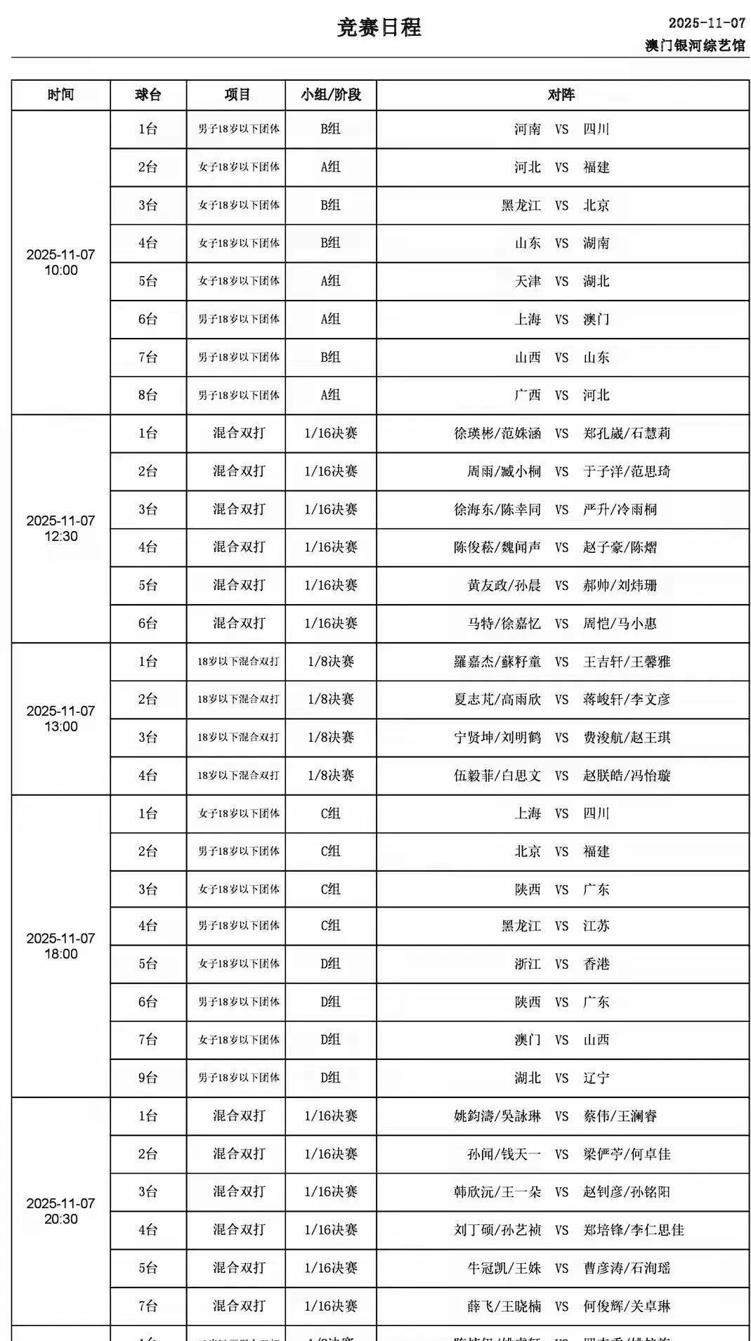 上海队的训练场从早上八点就亮着灯。 樊振东和赵子豪在最里面的球台练习发接发,球速快得带风声。 场边贴着详细的赛程表,混双比赛被红笔圈了出来。 教练偶尔喊停,指着球台角落比划落点。 训练馆墙上挂着“全运会乒乓球比赛指定用台”的横幅,日期明确印着“2025年11月7日”。