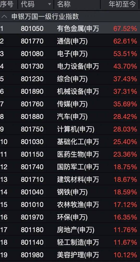 从申万一级行业来看,前三季度行业表现也出现巨大分化。有色金属、通信、电子位居前三,年内涨幅均超50%,电力设备、综合、机械设备、传媒、汽车、计算机、基础化工、医药生物等板块涨幅超过20%;煤炭、食品饮料、石油石化、交通运输等板块逆势下跌。