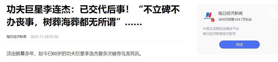 功夫巨星李连杰:已交代后事!“不立碑不办丧事,树葬海葬都无所谓”…… -每日经济新闻
