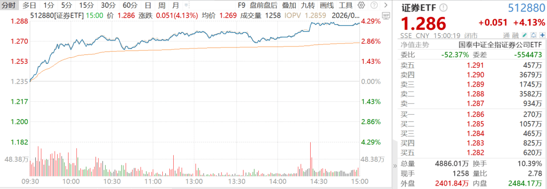 展望后市:伴随监管政策进入“积极”周期,券商投行、公募基金和海外业务或接棒传统业务,有望支持证券行业2026年盈利景气度;板块筹码结构改善、换手率降低,资金面压制等不利因素已基本出清;证券板块在主动权益基金中低配,《基金管理公司绩效考核管理指引(征求意见稿)》下发,证券板块因其“业绩相对稳增长+重要指数高权重”,有望得到公募资金补配;继中金合并东兴、信达后,证券行业合并重组有望稳步推进;板块估值存在修复空间,过往一年整体滞涨,看好证券板块的配置机会,投资者可以关注证券ETF(512880)。