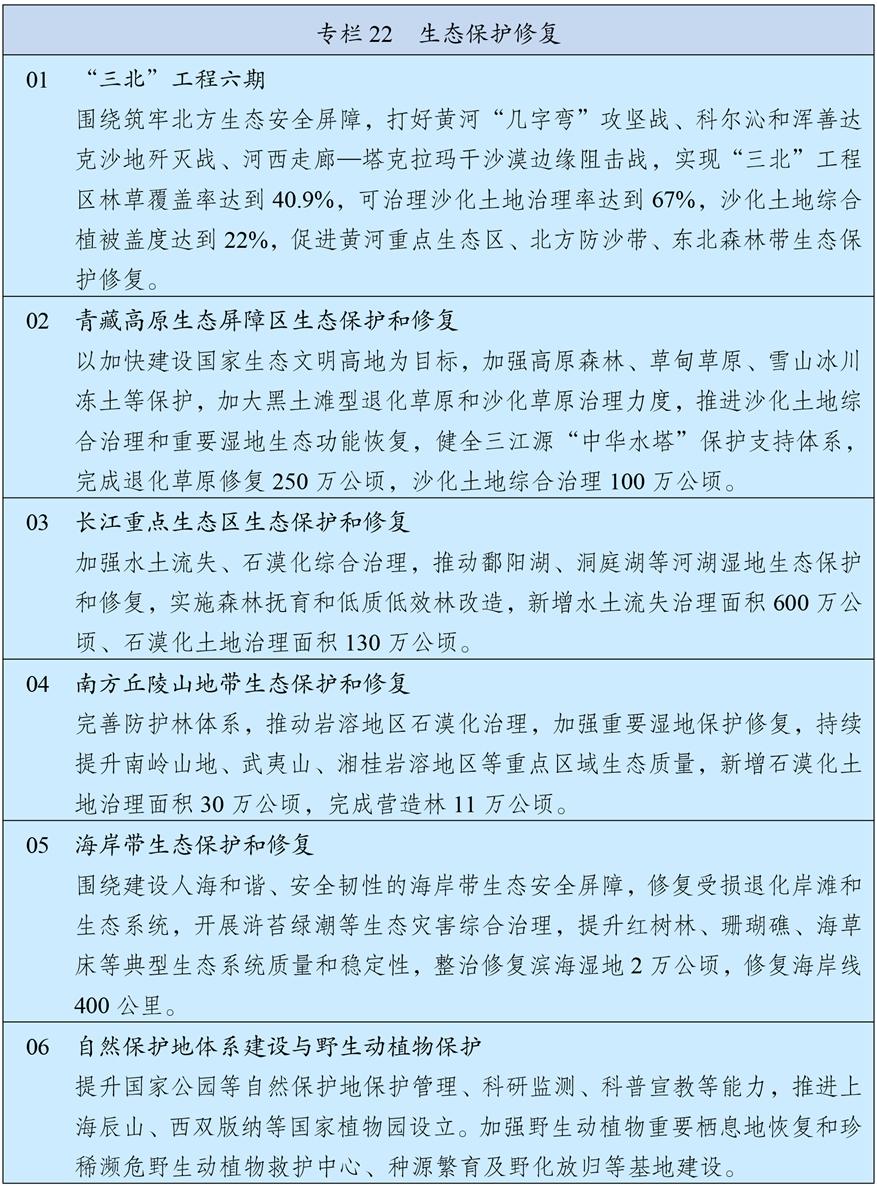 统筹推进重要生态系统保护和修复重大工程,持续巩固以“三区四带”为骨架的国家生态安全屏障体系。打好“三北”工程攻坚战,推动三大标志性战役取得决定性胜利。深入推进青藏高原生态保护,加强重点区域水土流失治理和石漠化治理。科学开展大规模国土绿化行动,推进森林质量精准提升和国家储备林建设,森林蓄积量达到224亿立方米,统筹草原生态修复与合理利用,加强湿地保护修复。推进超引地表水和超采地下水治理,开展历史遗留废弃矿山生态修复。