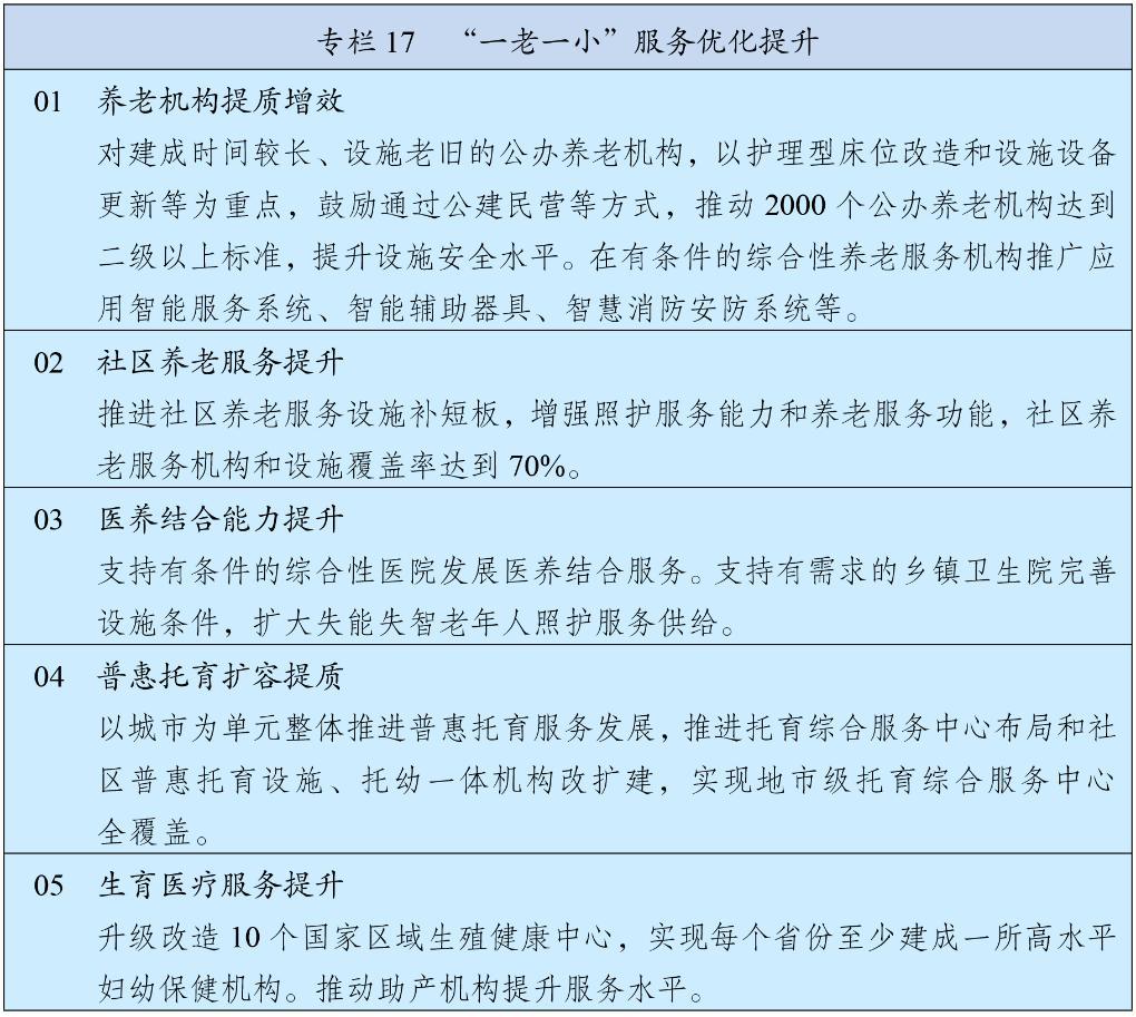 统筹规划养老服务设施布局,优化基本养老服务供给,推动养老服务扩容提质增效。深化养老服务改革发展,有序推进养老机构分类改革。发展社区嵌入式养老服务,培育专业化、品牌化、连锁化社区养老服务机构。发展家庭养老床位,推进居家适老化改造。发展互助性养老服务。健全失能失智老年人照护体系,增加养老机构护理型床位供给,积极推进医养结合。推行长期护理保险,健全统一的老年人能力评估制度。推进养老服务人员队伍职业化建设,提升养老服务综合监管质效。加强高龄独居老人和空巢老人关爱帮扶。