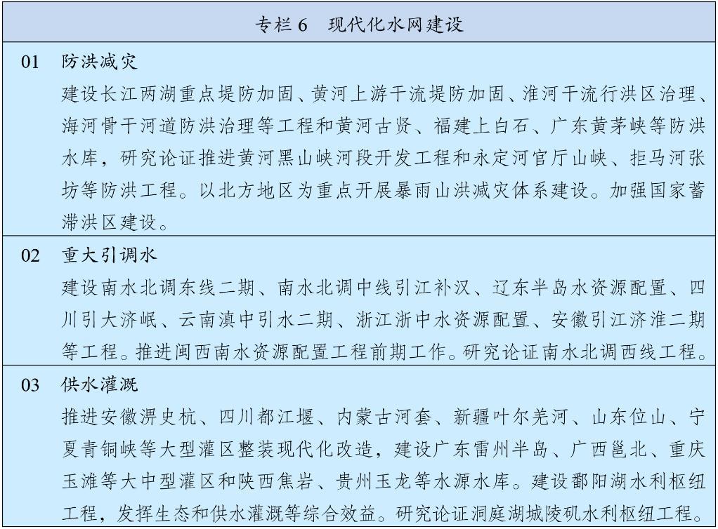 加强国家水网建设,增强洪涝灾害防御、水资源统筹调配、城乡供水保障能力。统筹流域性洪水和局域性灾害防御,加强防洪水库、河道及堤防、蓄滞洪区建设,推进中小河流系统治理和病险水库除险加固,增雨集中区防洪避险能力。健全跨流域跨区域水资源调配体系,完善国家水网主骨架和骨干输配水通道。加强供水灌溉保障,整装推进大中型灌区建设改造,加快城市应急备用水源工程建设。加强河湖生态保护治理,推进水源涵养与水土保持,提升水生态系统自我修复能力。实施地下水保护治理行动,逐步实现采补平衡。