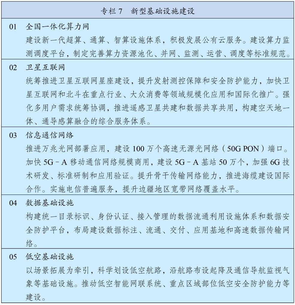 围绕支撑产业升级和数智化发展,推进新型基础设施布局建设和集约高效利用。完善信息通信网络,深化第五代移动通信(5G)、千兆光网规模部署,推进第五代移动通信演进(5G-A)、万兆光网建设发展和第六代移动通信(6G)技术创新,推动移动物联网自主迭代。深入推进东数西算工程,构建多层次算力设施体系和全国一体化算力网。实施国家区块链网络建设工程。完善民用空间基础设施,统筹建设卫星通信、导航、遥感系统,加快低轨卫星互联网组网。推进交通、能源、水利等基础设施数智化升级。