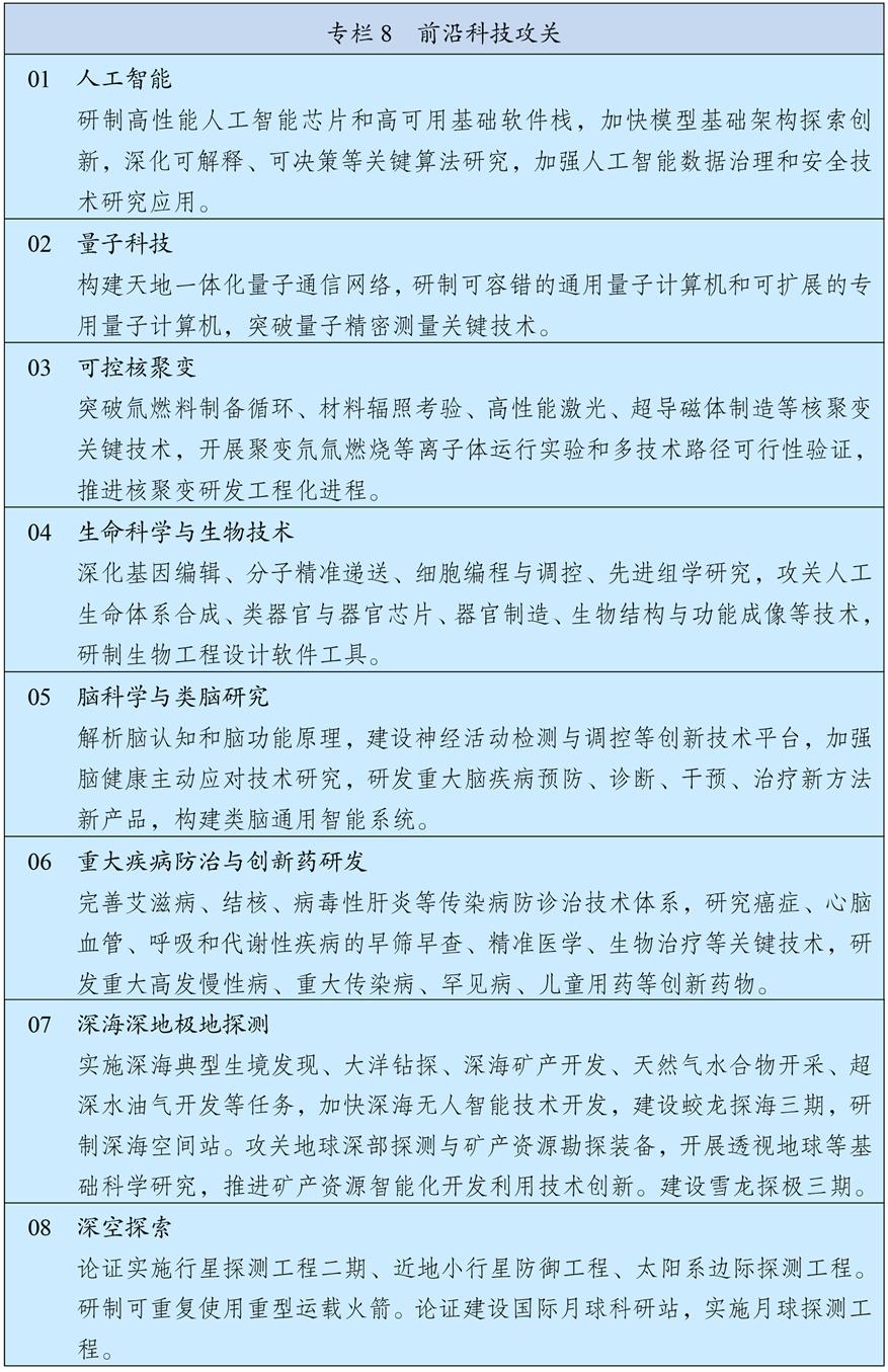 瞄准世界科技前沿强化系统布局,实施人工智能、量子科技、生物科技、新能源等科技战略部署,加快突破基础理论和底层技术,促进转化应用。高水平组织前沿技术预测预见,建立国家关键和新兴技术清单,持续推动前沿技术研发。强化科学研究、技术开发原始创新导向,优化有利于原创性颠覆性创新的环境,创新非共识项目遴选和资助机制,扩大国家重大科技任务、国家自然科学基金原创性颠覆性项目规模和比例。突出国家战略需求,扎实推进国家科技重大专项,超前部署面向2035的国家重大科技项目。