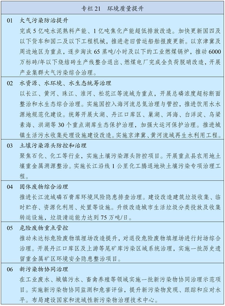 持续深入推进污染防治攻坚,以更高标准改善大气、水、土壤环境质量。以京津冀及周边、长三角、汾渭平原等重点区域为主战场,强化细颗粒物(PM2.5)控制,深入推进重点行业超低排放改造,推动挥发性有机物源头替代和全流程治理,制定下一阶段机动车排放和油品质量标准,深化大气环境绩效分级管理,氮氧化物、挥发性有机物排放量分别下降8%以上,进一步消除重污染天气。加强长江中游、成渝等区域大气污染防治。加强餐饮油烟、恶臭异味和环境噪声污染治理。统筹水资源、水环境、水生态治理,以解决全流域和跨省界突出问题为重点,加强重要江河湖库系统治理和生态保护,基本完成重点流域海域入河入海排污口排查整治,化学需氧量、总磷排放量分别下降6%,巩固城市黑臭水体治理成效、基本消除县乡黑臭水体。加强土壤污染源头防控,推进受污染耕地、建设用地安全利用。