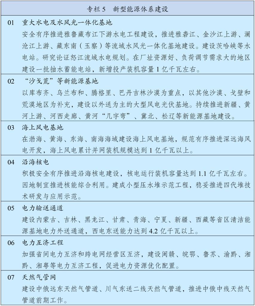 深入实施能源安全新战略,加快构建清洁低碳安全高效的新型能源体系,建设能源强国。推进非化石能源安全可靠有序替代化石能源,坚持风光水核等多能并举,实施非化石能源十年倍增行动。统筹就地消纳和外送,建设“三北”风电光伏、西南水风光一体化、沿海核电、海上风电等清洁能源基地,加强分布式能源就近开发利用,布局发展绿色氢氨醇,积极推进光热发电和地热能利用。加强化石能源清洁高效利用,推进煤电改造升级和散煤替代。着力构建新型电力系统,全面提升电力系统互补互济和安全韧性水平,优化全国电力流向和跨区域通道布局,加快智能电网建设,完善城乡配电网,科学布局抽水蓄能,大力发展新型储能。提高终端用能电气化水平,推动能源消费绿色化低碳化。基本建成全国统一电力市场体系,完善油气“全国一张网”运行调度机制。
