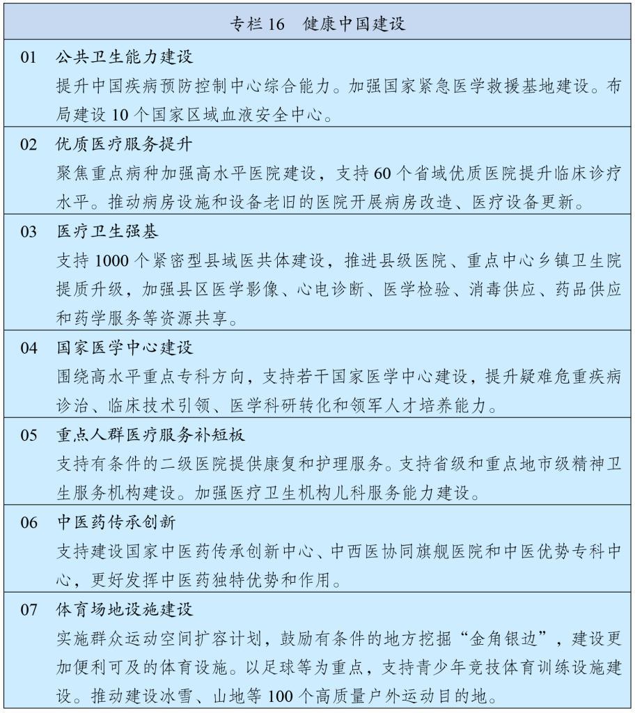 聚焦惠民生、补短板、增动能,优化政府投资结构。统筹“硬投资”和“软建设”,高质量推进国家重大战略实施和重点领域安全能力项目建设,实施一批重大标志性工程项目。加强人力资源开发和人的全面发展投资,在“一老一小”服务、基层医疗卫生、普通高中和优质高等教育扩容、职业技能培训等领域实施一批民生工程,提高民生类政府投资比重。适应人口结构变化和流动趋势,完善基础设施和公共服务设施布局。适应新质生产力发展要求,积极支持新型基础设施和无形资产投资。加强政府投资全过程管理,强化战略规划引领、项目谋划储备论证和事中事后监管,避免过度超前建设和低效无效投资。进一步明确中央和地方投资方向和重点,统筹用好各类政府投资,在工作基础较好的地方探索编制全口径政府投资计划。优化地方政府专项债券管理,完善“自审自发”机制,提高用于项目建设比重并单列。发挥新型政策性金融工具作用。深化投资审批制度改革,优化政府投资项目审批权限,修订政府核准投资项目目录,提升投资审批服务效能。