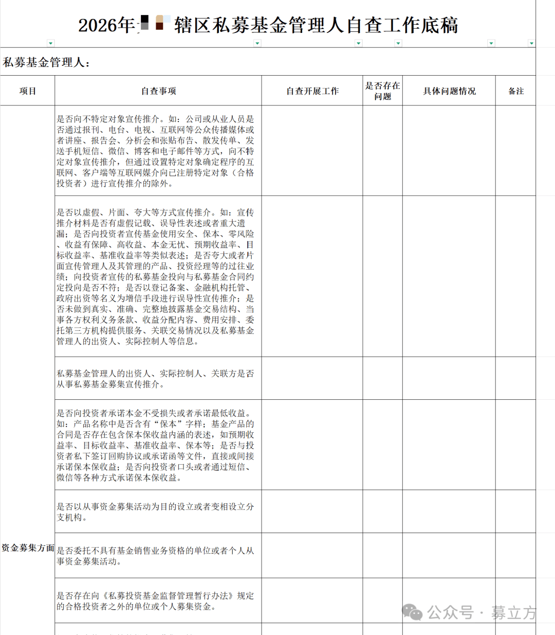 二是各私募基金管理人应当按照《2026年辖区私募基金管理人自查工作底稿》(附件1),逐项对照,全面排查,查找各项业务活动的存在的问题及风险隐患。针对发现的问题制定切实可行的整改计划,及时整改纠正。各私募基金管理人应按照《XX私募基金管理人2026年自查报告(模板)》(附件2)逐项填报相关内容形成自查工作报告,由主要负责人签字并加盖机构公章。自查报告(盖章扫描版)和自查工作底稿(EXCEL版)于2026年4月30日前通过政务服务平台报送我局。